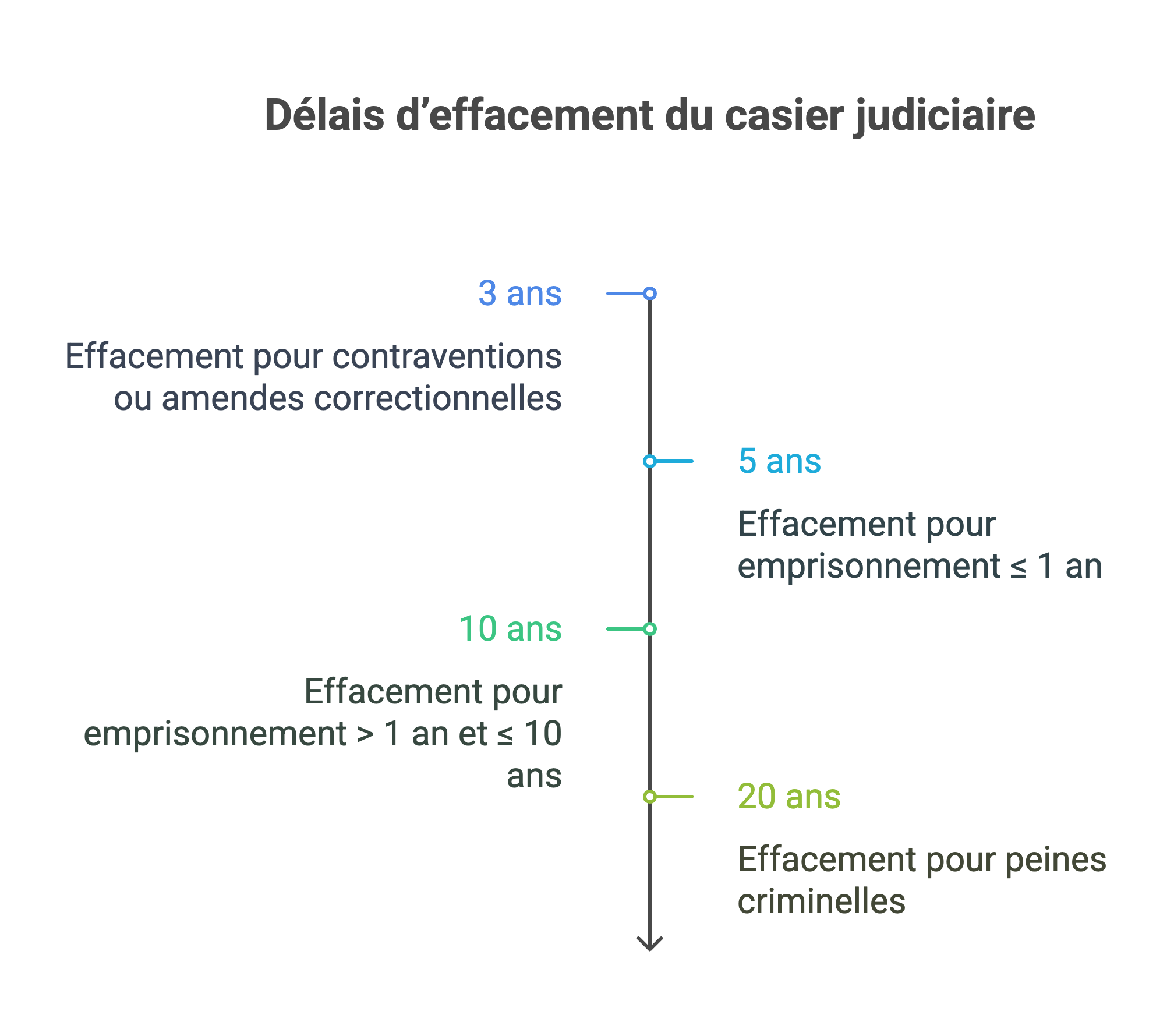 Les délais d’effacement sont fixés par la réhabilitation de plein droit (articles 133-12 à 133-16 du Code pénal) et varient selon la peine : 3 ans pour une amende, 5 ans pour un emprisonnement inférieur ou égal à un an (même avec sursis), 10 ans pour une peine plus lourde, et 20 ans pour une peine criminelle. Ces délais ne courent qu’une fois la peine exécutée intégralement (paiement des amendes, indemnisation, respect du sursis).