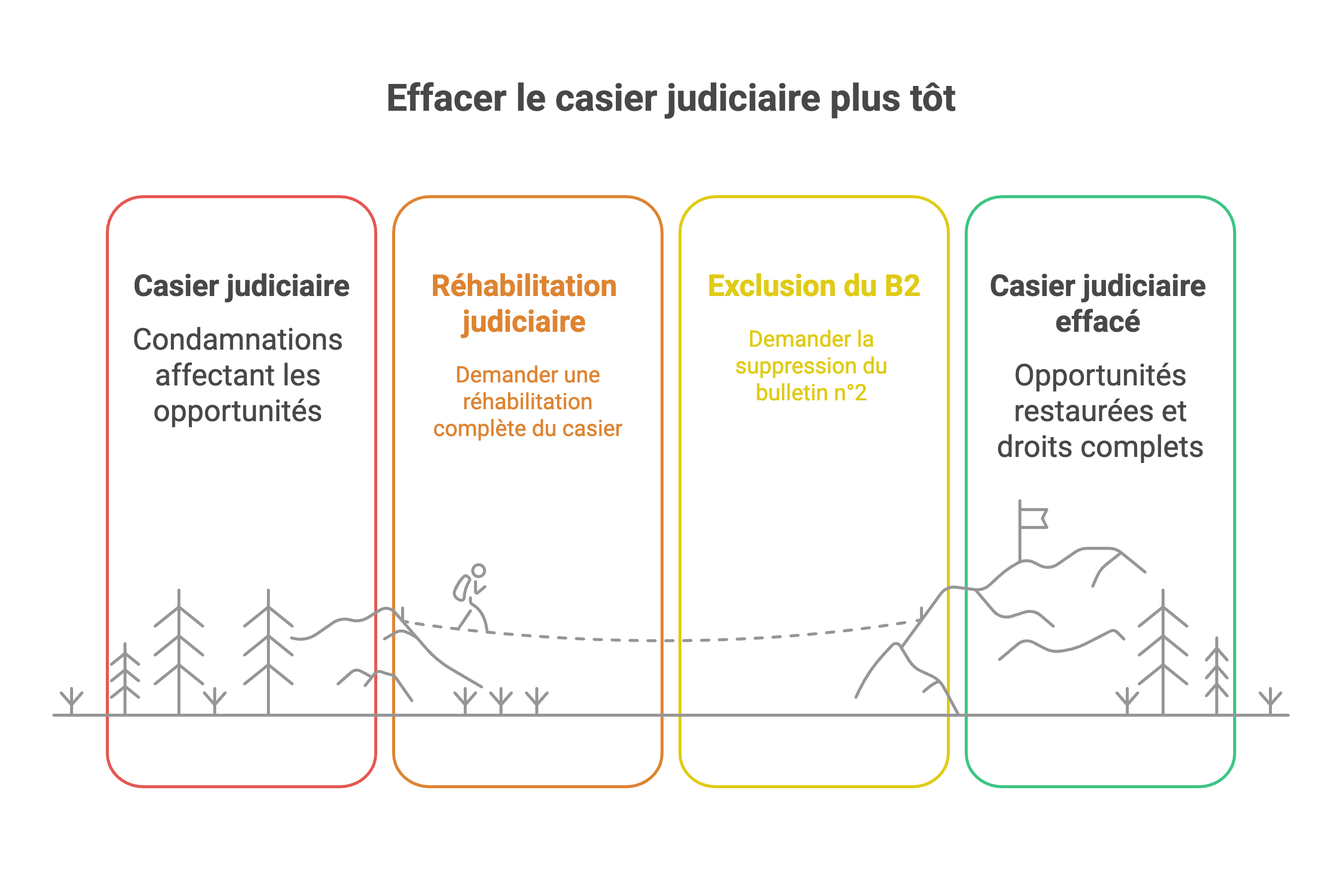 Les délais d’effacement automatique du casier judiciaire peuvent être très longs — parfois dix ou vingt ans selon la nature de la peine. Attendre passivement la réhabilitation de plein droit n’est donc pas toujours adapté, surtout lorsqu’un projet professionnel ou une procédure administrative (demande de naturalisation, carte professionnelle, agrément) est en jeu. Dans ces situations, il existe deux leviers juridiques permettant d’agir avant l’expiration des délais : la réhabilitation judiciaire et l’exclusion du B2.
