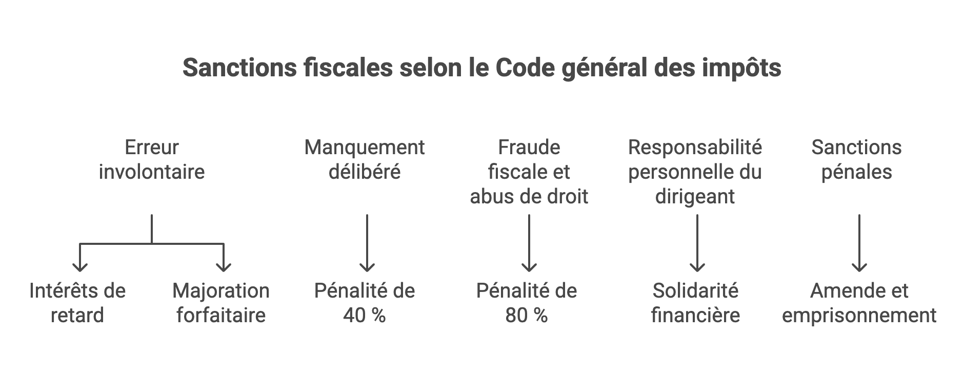 Lorsqu’il s’agit simplement d’une omission ou d’une négligence sans intention frauduleuse, l’entreprise encourt essentiellement des intérêts de retard de 0,20 % par mois (article 1727 du CGI), destinés à compenser le préjudice subi par le Trésor public. À cela s’ajoute une majoration forfaitaire de 10 %. Cette sanction reste limitée, mais elle peut rapidement alourdir le coût du redressement si les montants éludés sont importants ou si les retards s’accumulent.