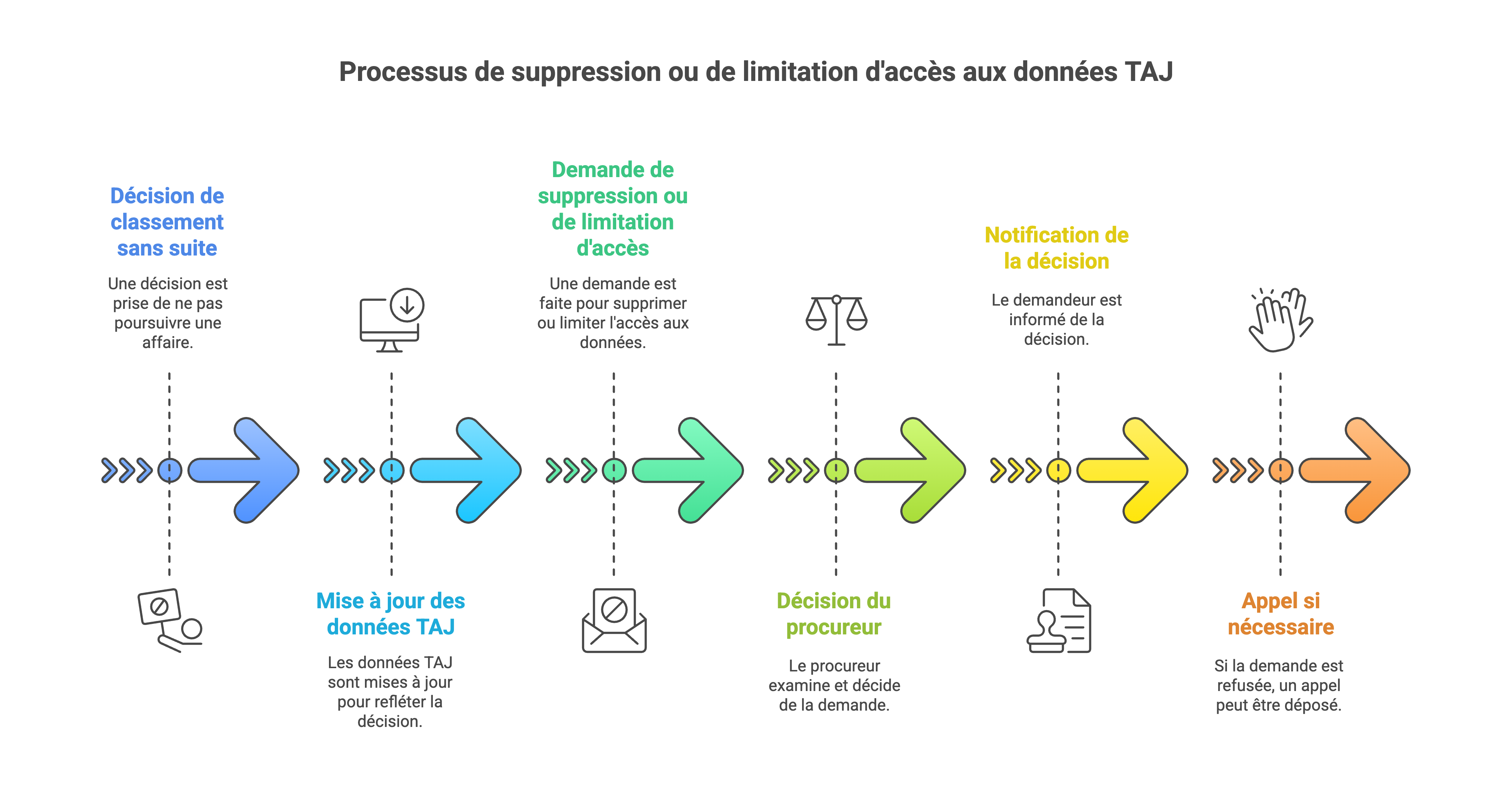 Étapes clés : courrier au procureur/magistrat TAJ, pièces solides, demande d’effacement ou limitation d’accès, puis recours si besoin.
