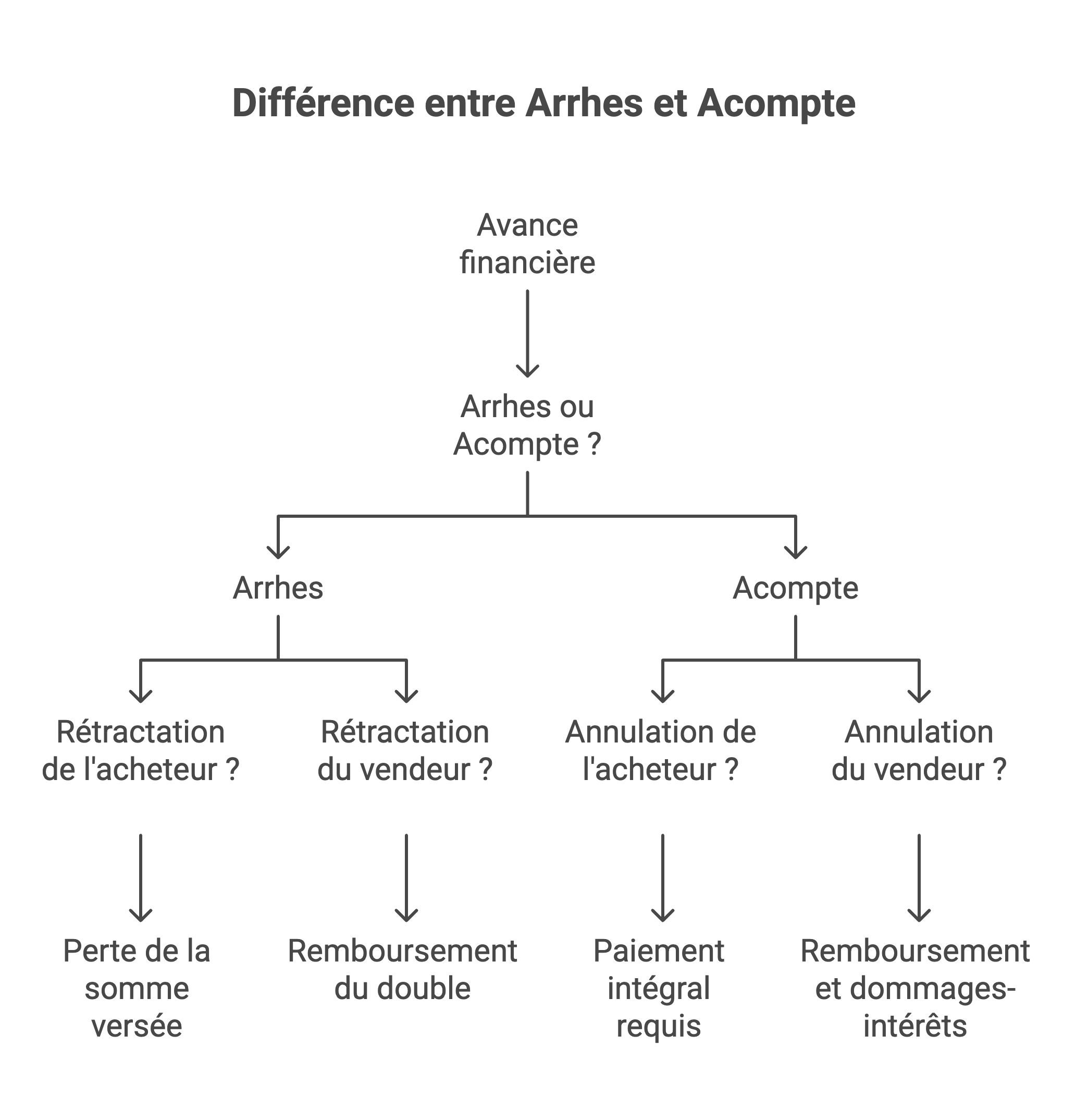 👉 Bon à savoir : Avec un acompte, le vendeur peut exiger l’exécution du contrat et même saisir le tribunal si vous refusez de payer le solde. L’annulation unilatérale est quasiment impossible sans accord amiable.