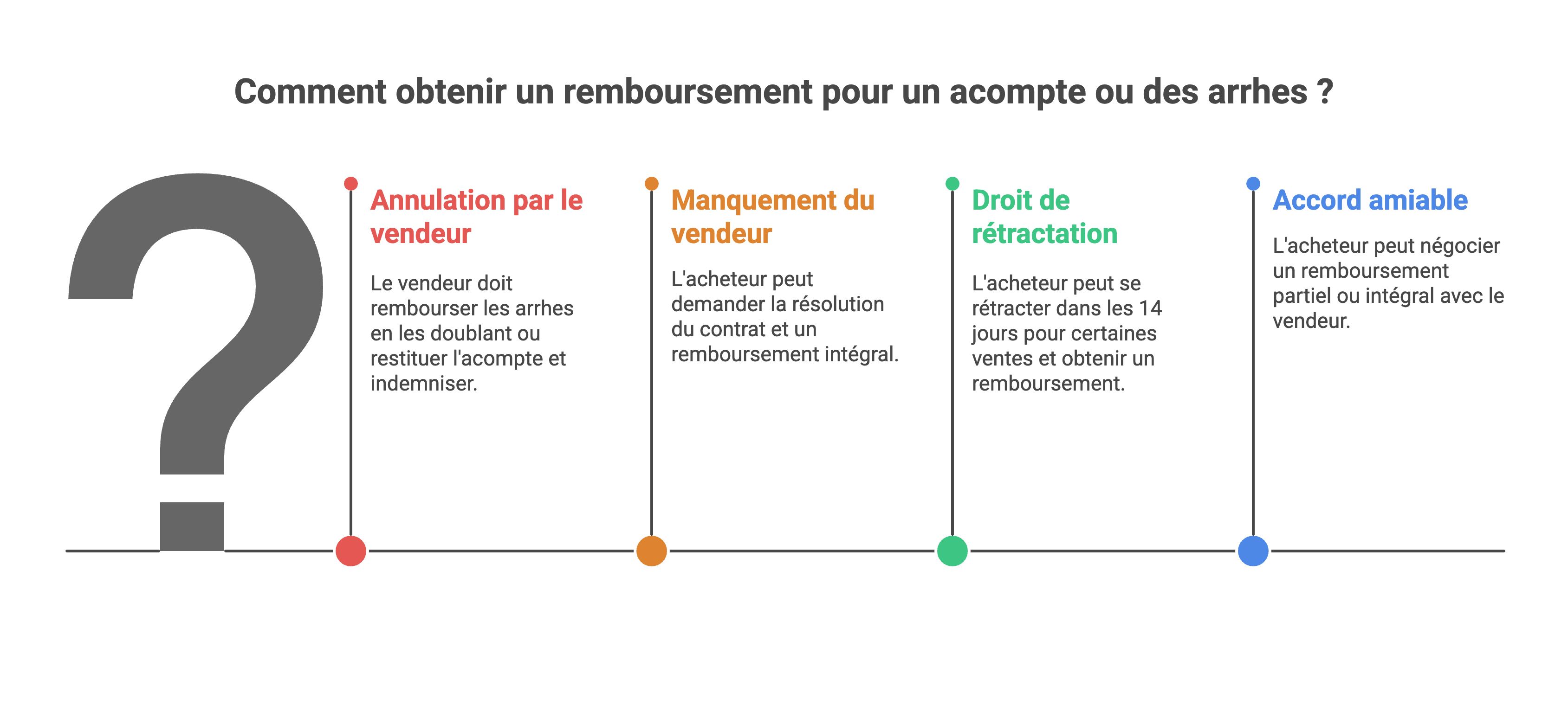 👉 Bon à savoir : En cas d’annulation par le vendeur, le remboursement du double des arrhes est automatique. Vous n’avez pas à le réclamer en justice pour l’obtenir, sauf en cas de refus manifeste.